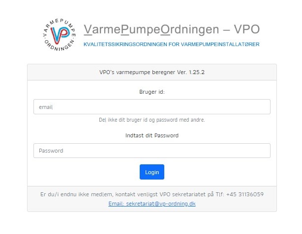 Som medlem får du adgang via login. Når du er medlem af VPO, får du adgang til beregningsprogrammet gennem et personligt login.